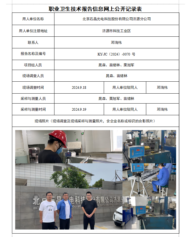 北京石晶光电科技股份有限公司济源分公司2024年度定期检测